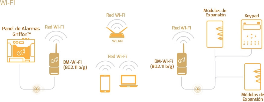 - Soporta Bridge Modules para comunicación de los módulos de expansión y teclado a través de redes Ethernet y Wi-Fi;